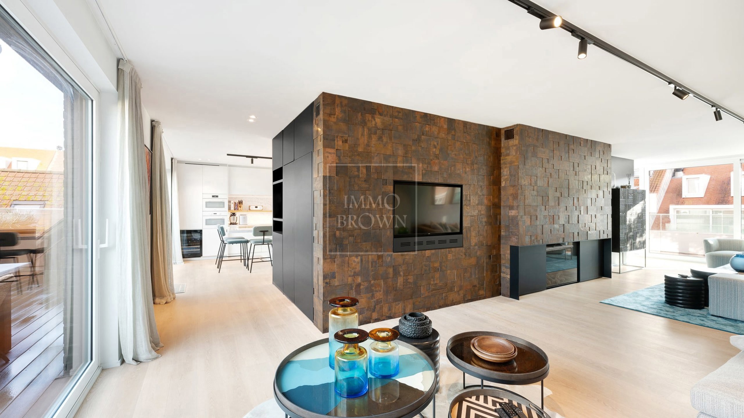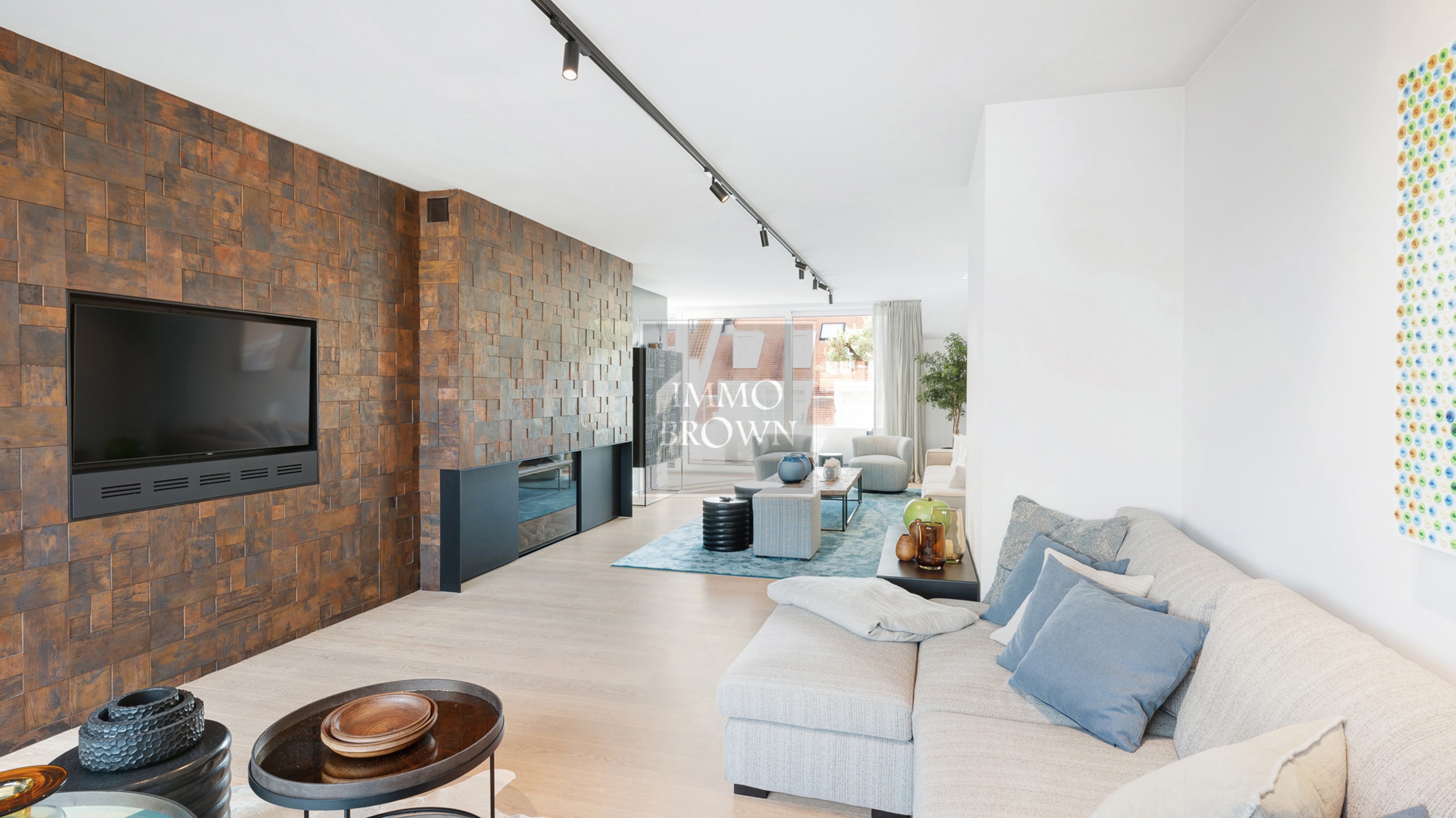 Le salon spacieux est baigné de lumière naturelle grâce à ses grandes baies vitrées et constitue le cœur de la maison — l'endroit idéal pour se détendre ou recevoir des invités dans un cadre élégant. L'espace de vie ouvert s'ouvre naturellement sur deux terrasses spacieuses, parfaitement orientées pour profiter du soleil et des panoramas urbains en toute intimité.