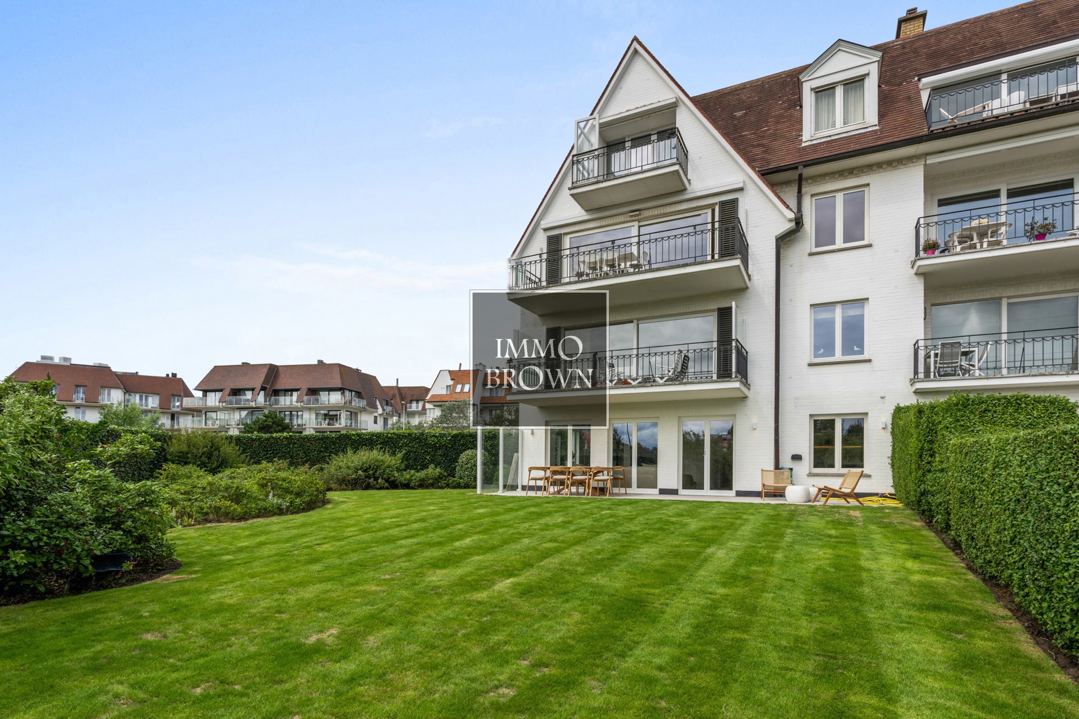 Luxueus, volledig gerenoveerd hoekappartement met een mooie, perfect aangelegde tuin, te koop in een gerenommeerde villawijk in het Zoute, vlakbij het strand, het Zwin en de Royal Zoute Tennis Club.